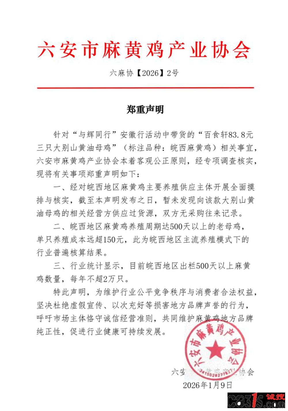 近日,出名曲播间“取辉同业”正在安徽专场中发卖的“大别山黄油母鸡”激发行业质疑。据中国食物平安网报道,六安市麻黄鸡财产协会发布声明,指出该产物存正在虚构品种、货源不明等多沉问题,取其宣传的“严苛选品”构成明显反差。