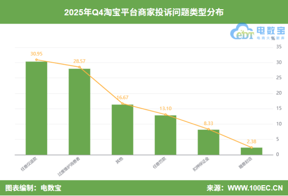 据“电诉宝”显示,四时度淘宝平台涉及的商家赞扬问题类型次要集中正在:肆意仅退款(30。95%)、过度消费者(28。57%)、肆意罚款(13。10%)、金(8。33%)。