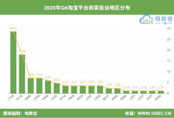 四时度,赞扬淘宝平台的商家注册地域TOP5顺次为广东省(28。57%)、浙江省(17。86%)、福建省(7。14%)、江苏省(7。14%)、安徽省(5。95%)。